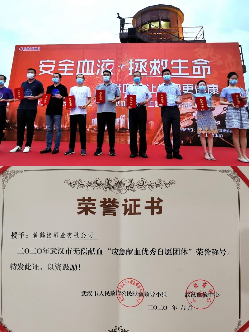 活動中,武漢市人民政府公民獻血領導小組聯合武漢市血液中心授予黃鶴樓酒業2020年武漢市無償獻血“應急獻血優秀自愿團體”榮譽稱號。