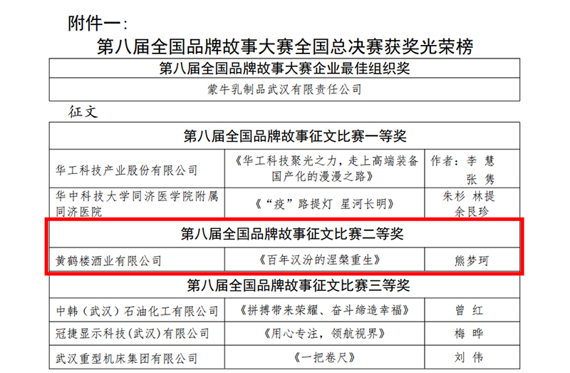 近日,黃鶴樓酒業(yè)在第八屆全國(guó)品牌故事大賽與質(zhì)量管理小組活動(dòng)中取得優(yōu)秀成績(jī)。作品《百年漢汾的涅槃重生》榮獲“第八屆全國(guó)品牌故事大賽征文比賽二等獎(jiǎng)”和“武漢賽區(qū)征文比賽二等獎(jiǎng)”。