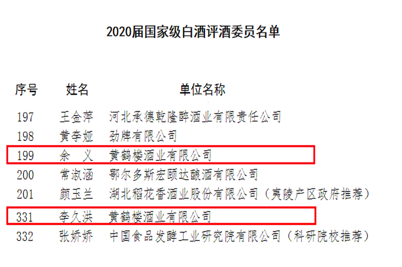 近日,第四屆全國白酒品酒職業(yè)技能競賽結(jié)果公布,黃鶴樓酒業(yè)李久洪、余義獲聘為中國酒業(yè)協(xié)會2020屆國家級白酒評酒委員。