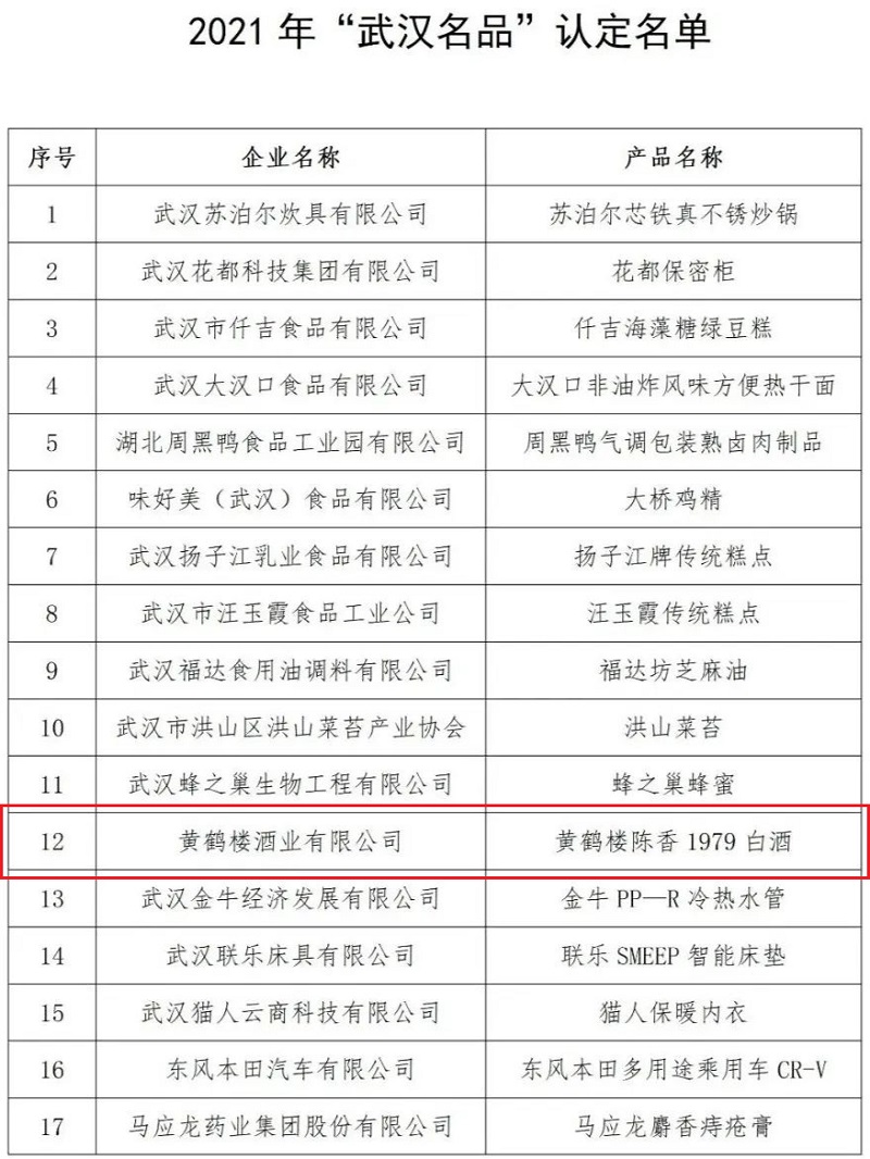 3月24日,2021年“武漢名品”認定名單公布,黃鶴樓酒業“黃鶴樓陳香1979”榜上有名。