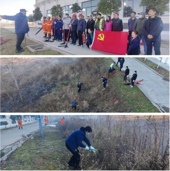 活動中,通過模擬由于野外用火管理不當(dāng)導(dǎo)致火源擴散發(fā)生火災(zāi)事故的場景,提升廠區(qū)消防應(yīng)急救援能力,同時通過此次活動焚燒廠區(qū)未建設(shè)區(qū)域荒地雜草,緩解廠區(qū)冬季山火險情壓力。按照預(yù)設(shè)活動方案,隨州黨支部組織黨員、義務(wù)救援隊員迅速分為警戒組、救援組、疏散組協(xié)同處置,積極參與活動,圓滿完成既定任務(wù)。