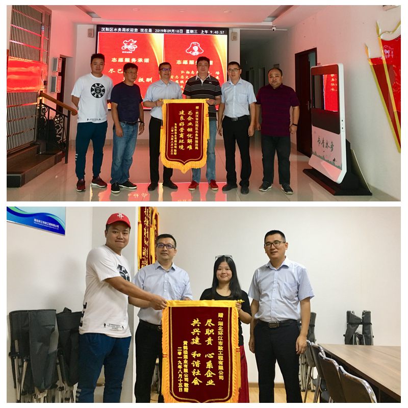 隨后,黃曉文一行前往湖北環江市政工程有限公司贈與錦旗,以表對黃鶴樓酒業武漢廠區雨污分流工程建設的感謝之情。